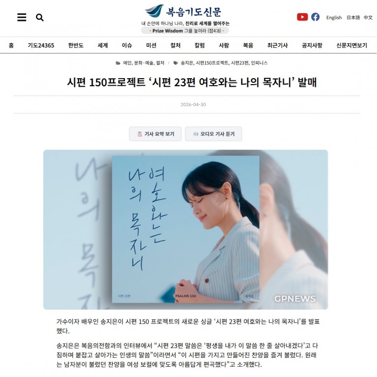 [기사] 시편 150프로젝트 ‘시편 23편 여호와는 나의 목자니’ 발매(복음기도신문)