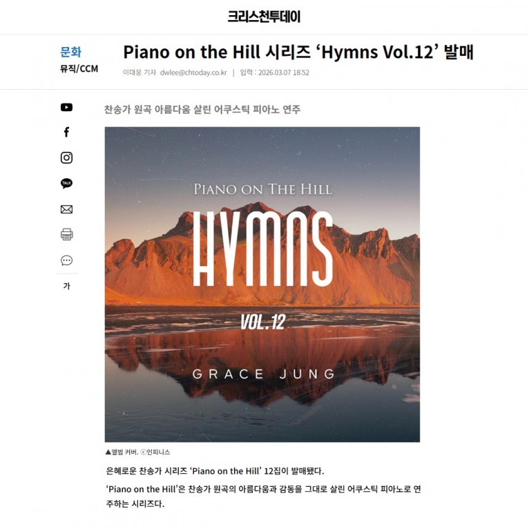 [기사] Piano on the Hill 시리즈 ‘Hymns Vol.12’ 발매(크리스천투데이)