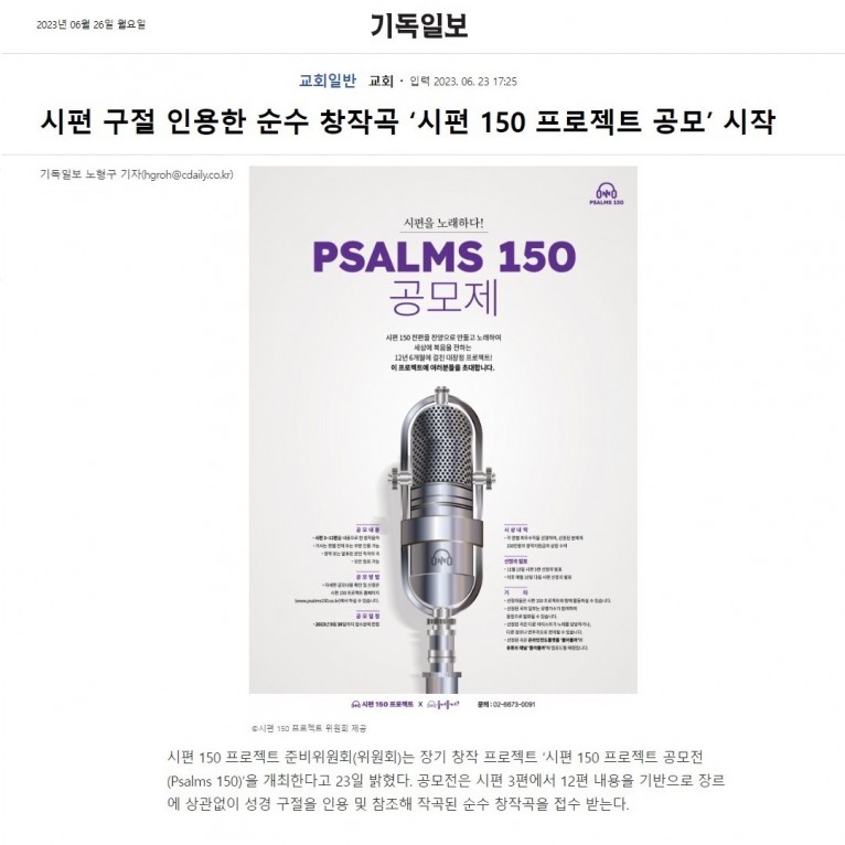 [기사] 시편 구절 인용한 순수 창작곡 ‘시편 150 프로젝트 공모’ 시작(기독일보)