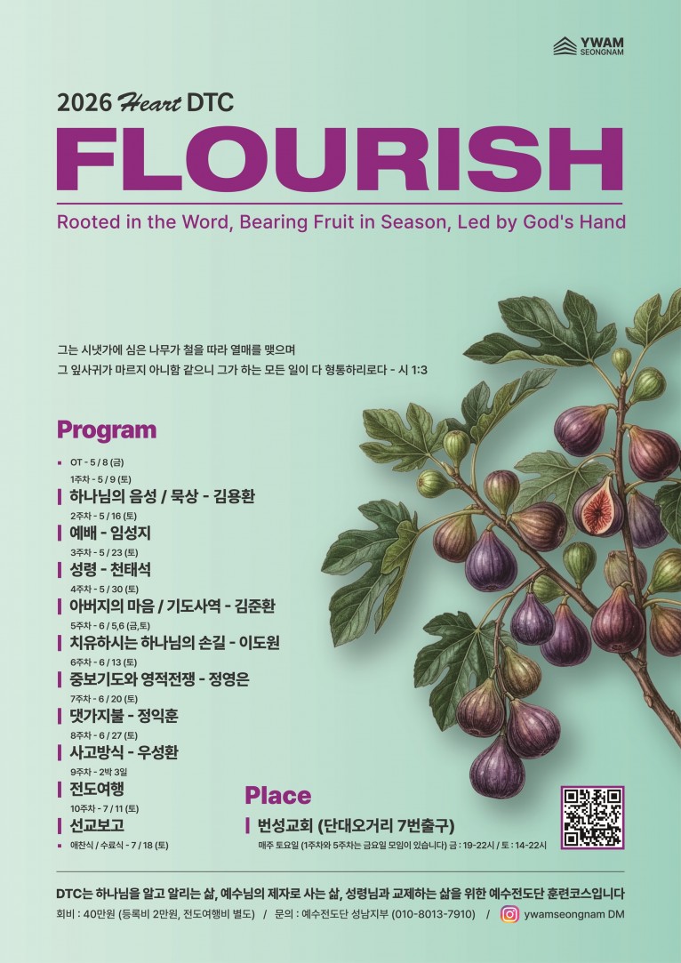 5월 8일부터 7월 18일까지 매주 토요일, 번성교회(담임 문충만 목사, 단대오거리 7번 출구)에서 진행될 이번 과정에 대한 문의는 예수전도단 성남지부 010-8013-7910, Instagram DM (ywamseongnam)으로 가능하다.